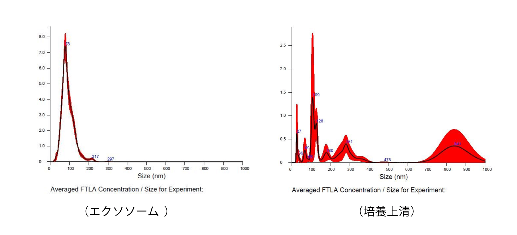我院制作的外泌体与培养上清液,通过 NanoSight 设备进行测量,并绘制出显示粒径(横轴)与粒子数(纵轴)的图表。