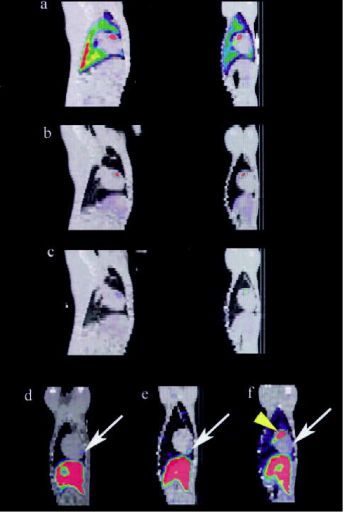 Hình ảnh mặt cắt trước ( bên phải), mặt cắt dọc ( bên trái) của kết quả chụp SPECT/ CT, thể hiện sự hấp thụ ngày 1 ( a), ngày 2 ( b), ngày 7 ( c) tại tâm thất trước của tim động vật. Hình ảnh cuối chụp thời điểm ngày thứ 5 ~ 8, khu vực hấp thụ MSC (mũi tên) thể hiện trên ảnh chụp mặt cắt bên của 3 đại điện.