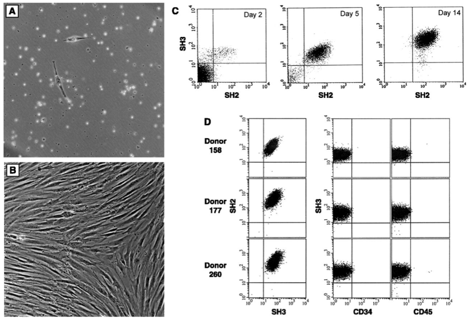 Kết quả nuôi cấy ngày thứ 2 , 5 và 14 sau khi sử dụng kháng thể SH3 và SH2 xuất hiện trên các dấu hiệu bề mặt. Vào ngày thứ 14, các tế bào sẽ đồng nhất đến khoảng 95~99%, phản ứng âm tính đối với kháng thể CD45 (Pharmingen), hoặc CD14, CD31 (Becton- Dickinson) thông qua tế bào tạo máu. (D) Khả năng tái hiện và tính đồng nhất trong quá trình phân tách được ly được chứng thực bằng phương pháp đo dòng tế bào.