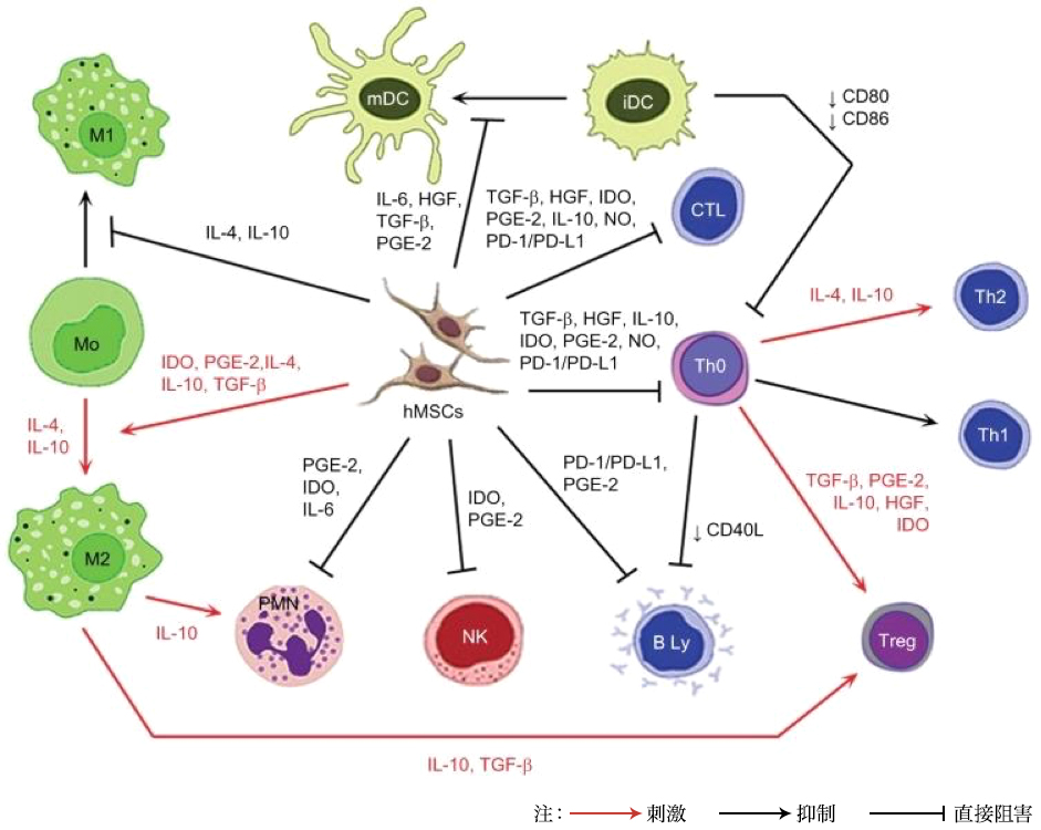 Lưu ý: mũi tên màu đỏ: kích thích; mũi tên màu đen: ức chế, mũi tên không có đầu mũi tên: Ức chế trực tiếp, từ viết tắt: iDC, tế bào đuôi gai chưa trưởng thành; IL, Interleukin; HGF, yếu tố tăng trưởng tế bào gan; TGF-β, yếu tố tăng trưởng chuyển dạng β; PGE-2, Prostaglandin E2; IDO, Indoleamine 2,3-dioxygenase; NO, Nitric oxide; PD-L1, Programmed death-ligand 1; hMSC, tế bào gốc trung mô của người; Treg, T regulatory; Th, T helper cell; CTL, Lympho bào T độc tế bào; mDC, tế bào đuôi gai trưởng thành; PD-1,Programmed cell death protein 1; PMN, bạch cầu đa nhân; NK, tế bào NK.