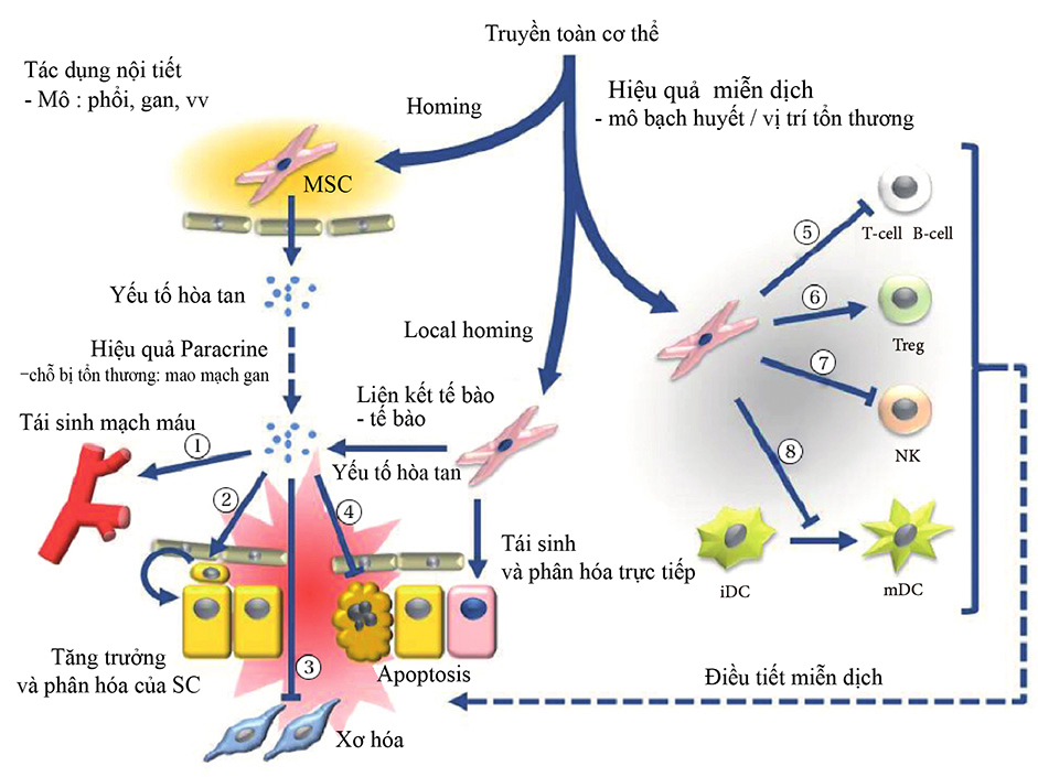 Trị liệu toàn thân bằng tế bào gốc trung mô làm nâng cao hiệu quả Paracrine và hoạt động nội tiết.1) Yếu tố tăng trưởng nội mô mạch máu (VEGF), yếu tố tăng trưởng giống Insulin-1 (IGF-1), protein hoá hướng động tế bào đơn nhân-1 (MCP1), yếu tố tăng trưởng nguyên bào sợi cơ bản (bFGF), Interleukin (IL6). 2) Sự phân hóa và tăng trưởng của tế bào gốc: yếu tố tế bào gốc (SCF), yếu tố ngăn ngừa bênh máu trắng (LIF), yếu tố kích thích đại thực bào “Macrophage colony” (MCSF), yếu tố dẫn xuất tế bào mô đệm “Stroma” 1 (SDF1), Angiopoietin 1, Activin A. 3) Ức chế xơ hóa: yếu tố tăng trưởng tế bào gan (HGF), bFGF, Adrenomedullin (ADM). 4) Ức chế sự chết rụng tế bào: VEGF, HGF, IGF1, yếu tố tăng trưởng chuyển dạng beta (TGF), yếu tố kích thích đại thực bào bạch cầu hạt (GM CSF), Activin A, Thrombospondin 1. Hiệu quả miễn dịch bao gồm các tác dụng sau đây (5~8). 5) Ức chế tế bào B và T: kháng nguyên bạch cầu ở người G5 (HLA G5), HGF, hỗn hợp nitric oxide synthase (iNOS), Indoleamine 2,3-dioxygenase (IDO), Prostaglandin E2 (PGE2), bFGF, TGFβ. 6)Tăng trưởng và phân hóa dựa vào việc phát hiện TGFβcủa tế bào ức chế T (Treg). 7)Ức chế tế bào NK ( natural killer cell) bằng cách tiết ra TGFβvà IDO, PGE 2. 8) Ức chế sự phát triển của tế bào đuôi gai (DC) bằng cách tiết ra PGE 2. Hình 「Stem Cell Res Ther」được tái hiện bởi Carrión và Figueroa. 11/5/2011; 2(3):23.