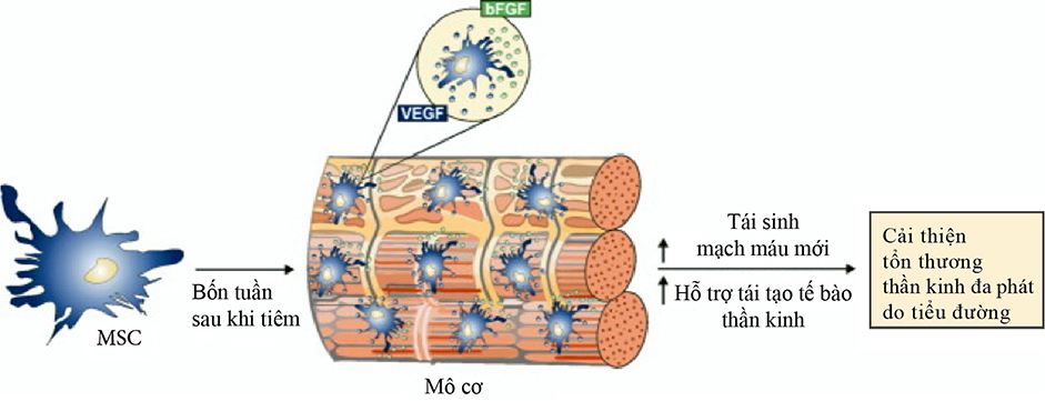 Hiệu quả của liệu pháp MSC đối với bệnh lý thần kinh đa phát do tiểu đường. Sau 4 tuần tiêm vào cơ bắp, MSC sẽ tạo ra VEGF và bFGF, tích lại ở giữa các sợi cơ, hình thành các mạch máu mới, giúp duy trì sự tái sinh của tế bào thần kinh, cải thiện bệnh lý thần kinh đa phát do tiểu đường. Viết tắt: bFGF (yếu tố tăng trưởng nguyên bào sợi cơ bản), MSC (tế bào gốc trung mô), VEGF (yếu tố tăng trưởng nội mô mạch máu).